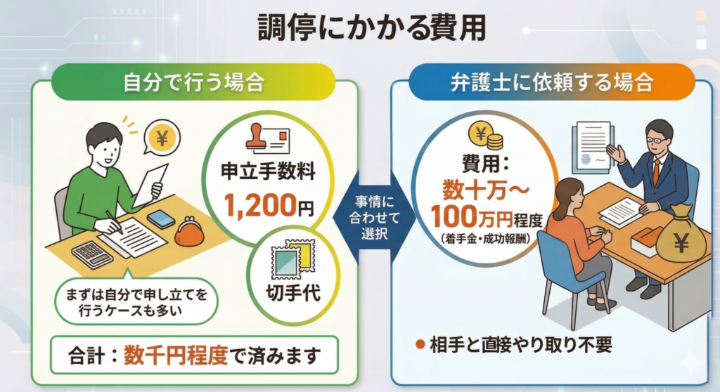 弁護士に依頼する場合は数十万〜100万円程度の費用がかかりますが、「どうしても相手と直接やり取りしたくない」などの事情がなければ、まずは自分で申し立てを行うケースも多いです。