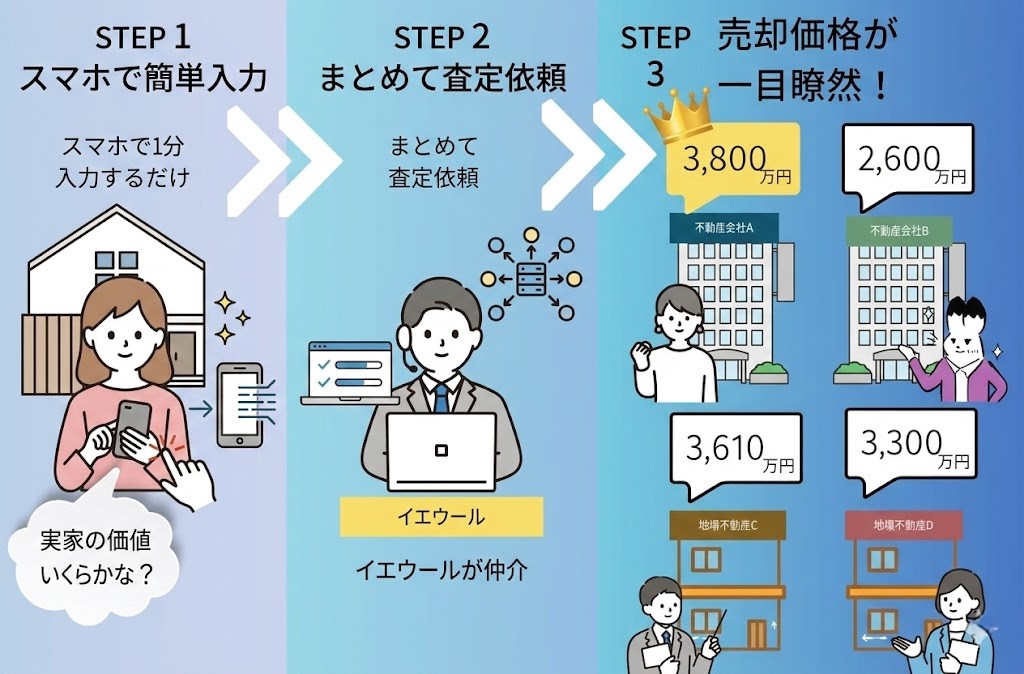 イエウールを使えば無料・最短1分で査定依頼ができるので、いまのうちに調べておきましょう!